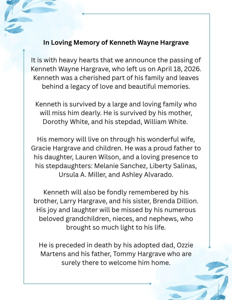 To send flowers to the family in memory of Kenneth Wayne Hargrave, please visit our flower store.
